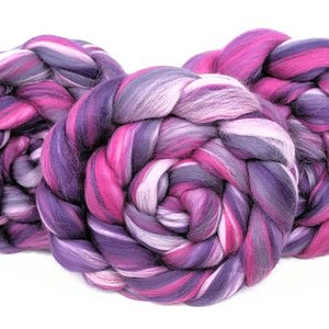 This is a commercially dyed and blended top that combines royal purple, fushia and lilac coloured merino. It is next to skin soft and spins up like butter.