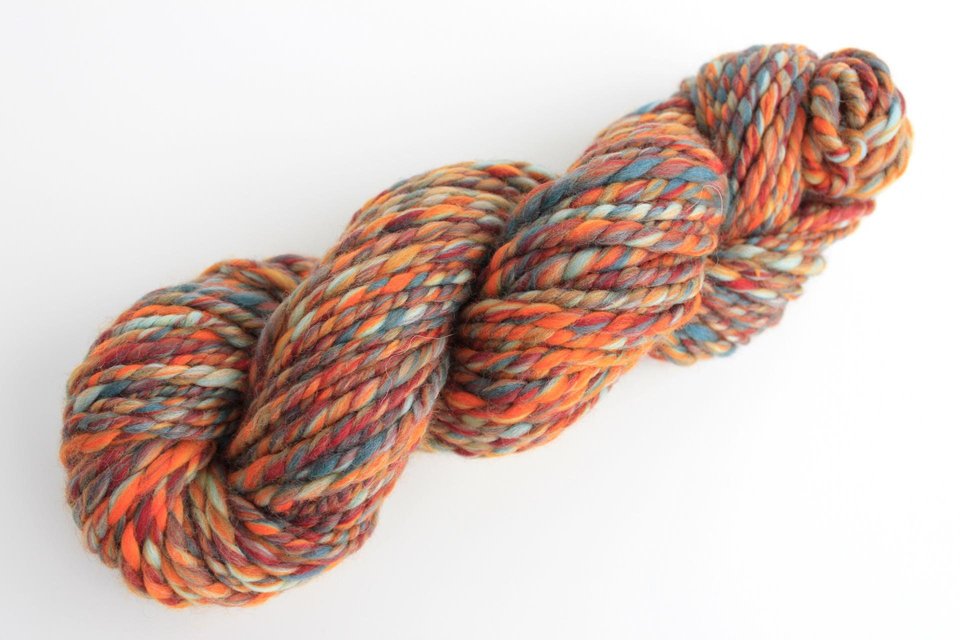 This is a commercially dyed and blended top that consists ofvarious shades of blue, red and orange merino. It is next to skin soft and will spin up into a beautiful yarn with bright pops of colour.